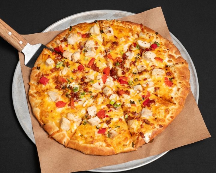 Garlic cream sauce, grilled chicken, bacon, green onion, roasted red pepper, cheddar blend