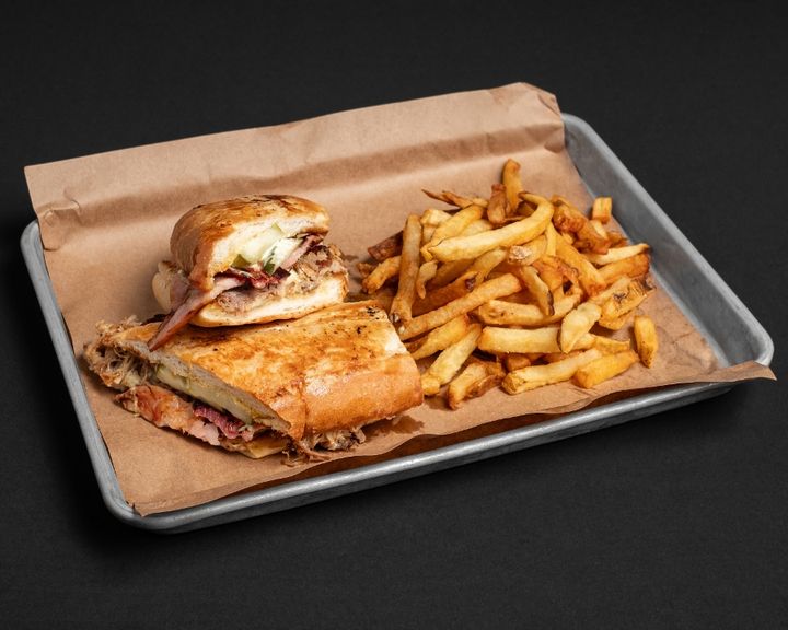 House recipe pork carnitas, ham, mayo, mustard, pickle, Swiss cheese, pressed on Cuban bread
